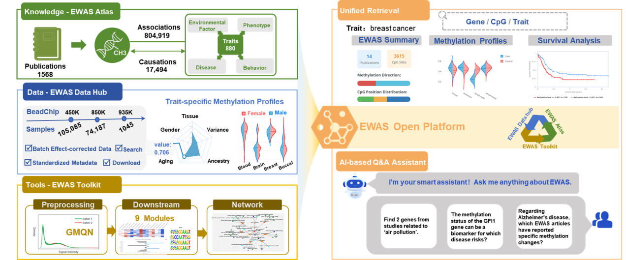 表观组全基因组关联研究(Epigenome-Wide Association Studies, EWAS)在解析复杂性状的表观遗传机制方面具有不可替代的价值。自2018年以来,EWAS Open Platform通过EWAS Atlas(文献审编知识库)、EWAS Data Hub(标准化 DNA甲基化数据库)和 EWAS Toolkit(一站式分析工具库)持续扩展服务体系,截至2025年11月,该平台已累积被引用515次。