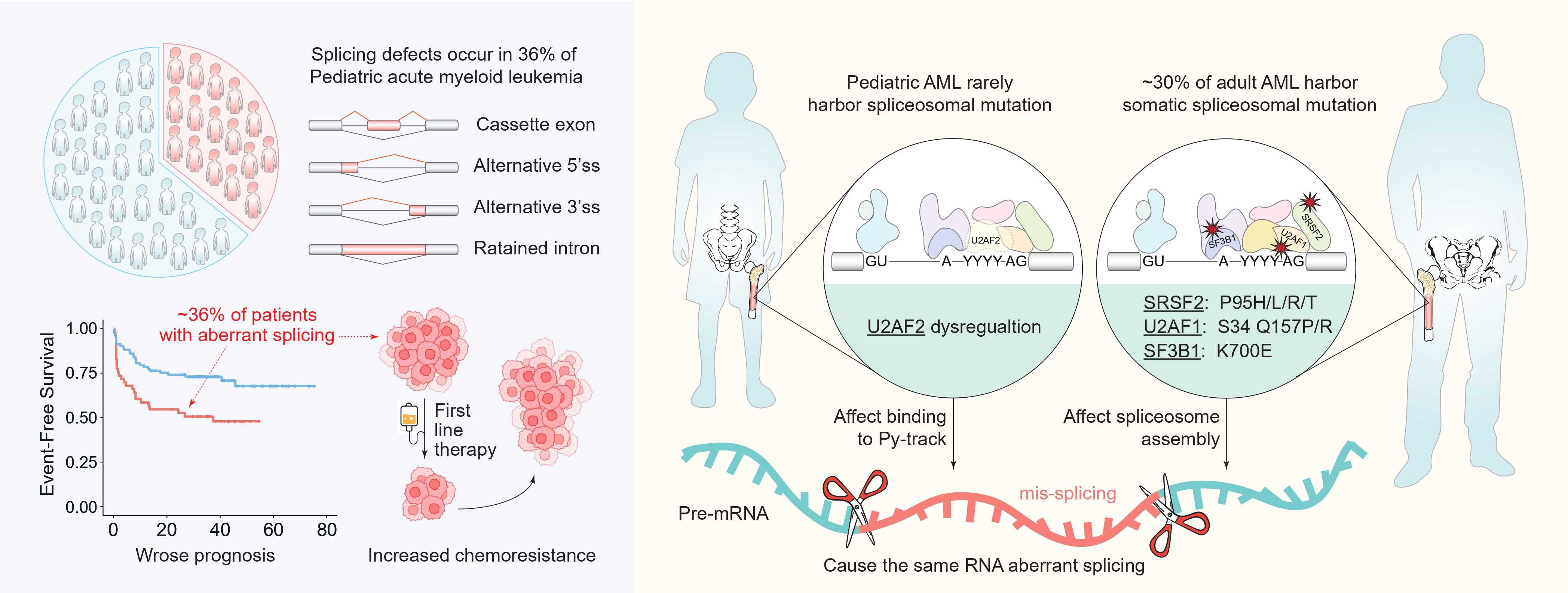 通过大规模儿童AML队列分析,该研究首次发现了占比约36%的、具有U2AF2功能失调为核心特征的剪接异常病人亚型,阐明了其与治疗耐药之间的联系,并提出了可行的药物干预思路。不仅加深了对儿童AML转录组异质性的理解,也为开发基于RNA剪接调控的精准治疗策略提供了重要理论依据和潜在靶点。