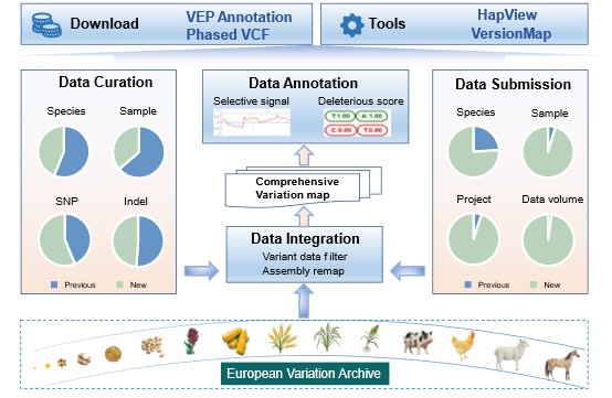 随着测序技术的快速发展,越来越多物种的基因组被高质量解析,不同物种及其群体的全基因组变异数据呈现指数式增长,为遗传多样性评估、群体进化分析、功能基因挖掘、分子育种和疾病相关变异研究等提供了坚实的数据支撑。自2017年上线以来,GVM持续推进多物种变异组学数据的标准化审编分析、规范汇交、开放共享与安全管理,已成为我国遗传变异研究的重要基础设施。