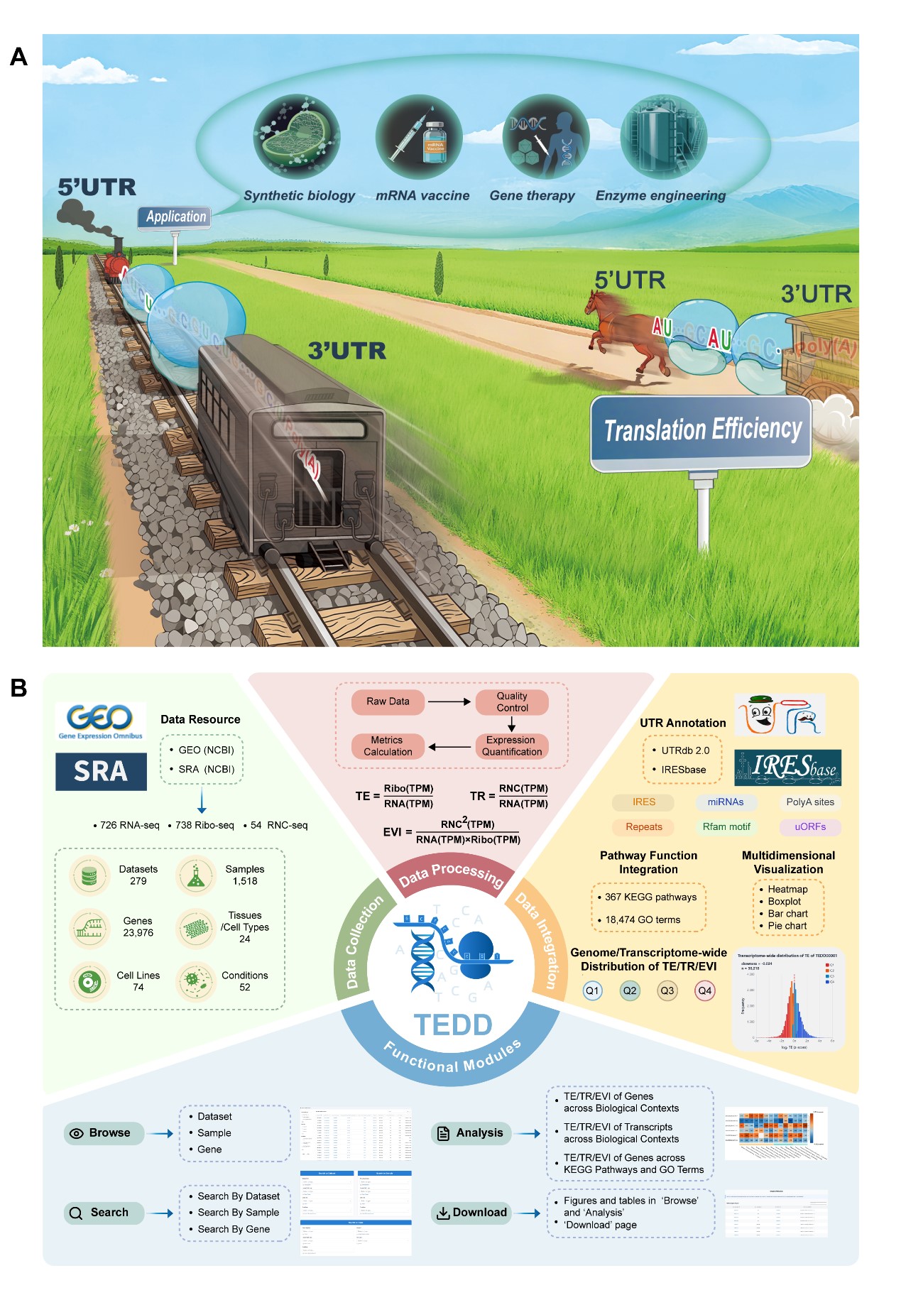 作为当前整合规模最大的人类翻译组学数据库,TEDD实现了基因与转录本双水平指标量化、UTR调控元件深度注释、多维度数据比较分析的三大突破,显著超越现有同类资源。该数据库不仅为翻译效率动力学研究提供了全面系统的资源支撑,更在mRNA疫苗开发、合成生物学、基因治疗、酶工程等生物制造领域具有重要应用价值,将助力科研人员实现基因表达系统的精准设计与高效蛋白质生产。